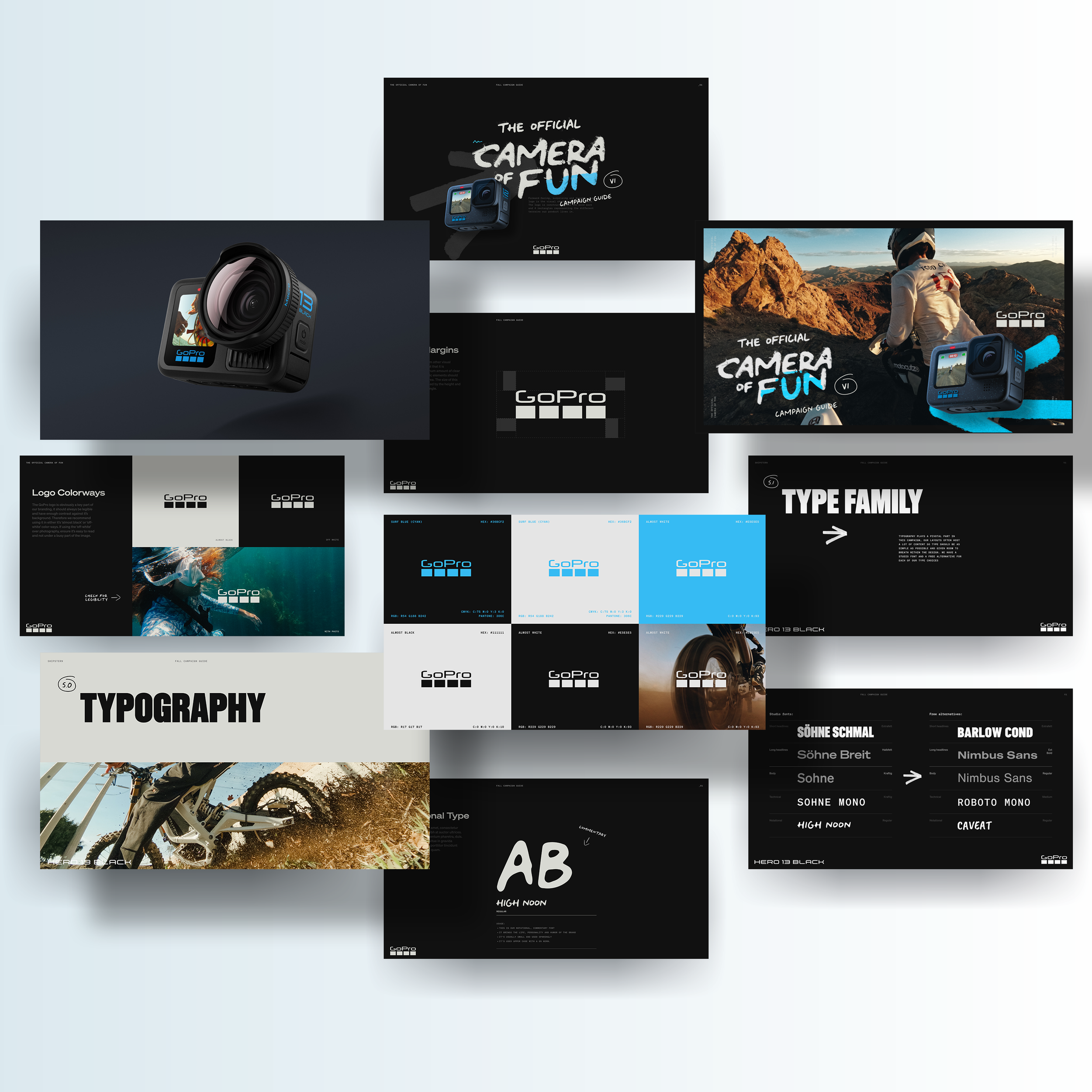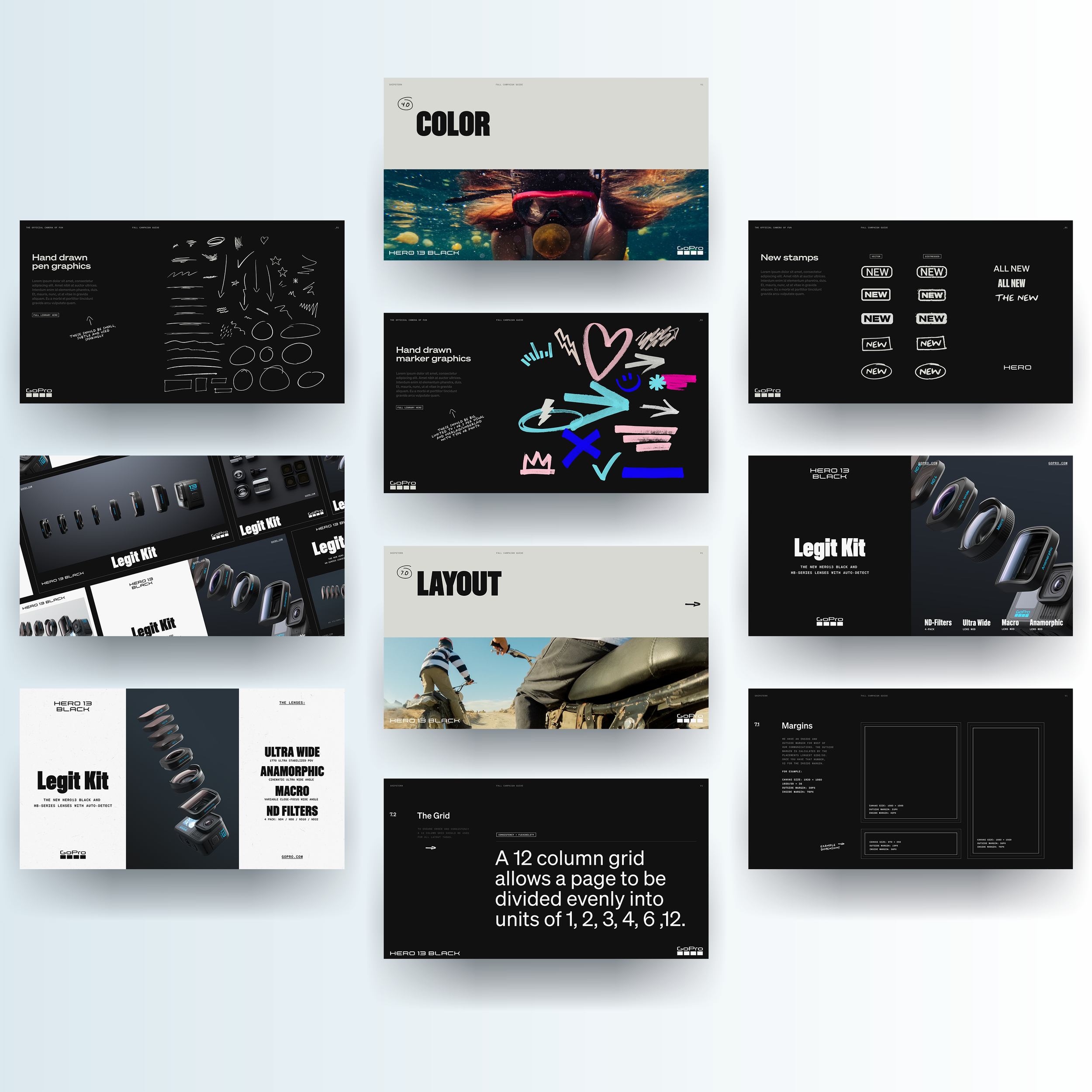 As the head of global creative at GoPro, I built the first dedicated brand team and led the development of the first comprehensive brand system. This included everything from foundational elements like logo, color and typography choices to packaging design systems, individual campaign guidelines, retail design guidelines and a new digital platform to house and distribute it all.